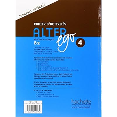 Structure :→ Le cahier d'activités d'Alter Ego 4 vient en complément du livre de l'élève dont il suit la structure.→ Il propose de renforcer les connaissances acquises à travers une grande variété d'activités :de vocabulaire de grammaire de communicationde production orale, de compréhension et de production écrites, à faire en classe ou en autonomie→ Il propose des Techniques Pour ... dont l'objectif est d'élargir les savoir-faire scolaires et universitaires travaillés dans le manuel.→ A la fin du cahier, un portfolio permet également à l'apprenant d'évaluer son apprentissage de façon active et réfléchie.